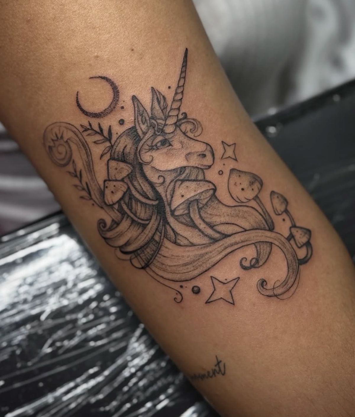 What makes this particular piece so special is the play between softness and drama: No hard outline here, only sculpted light and shadow that look good on all skin tones. It’s so great compared to many of those other more cartoonish unicorn ideas, because this one grows up beautifully—there’s no heavy color in it that will fade over time, and the shapes are bold enough to stay readable. If minimal, aesthetic tattoos that still pack a big punch of meaning are your jam, this portrait speaks louder than some noisier designs—and is just as apt in the boardroom as it is at a festival.