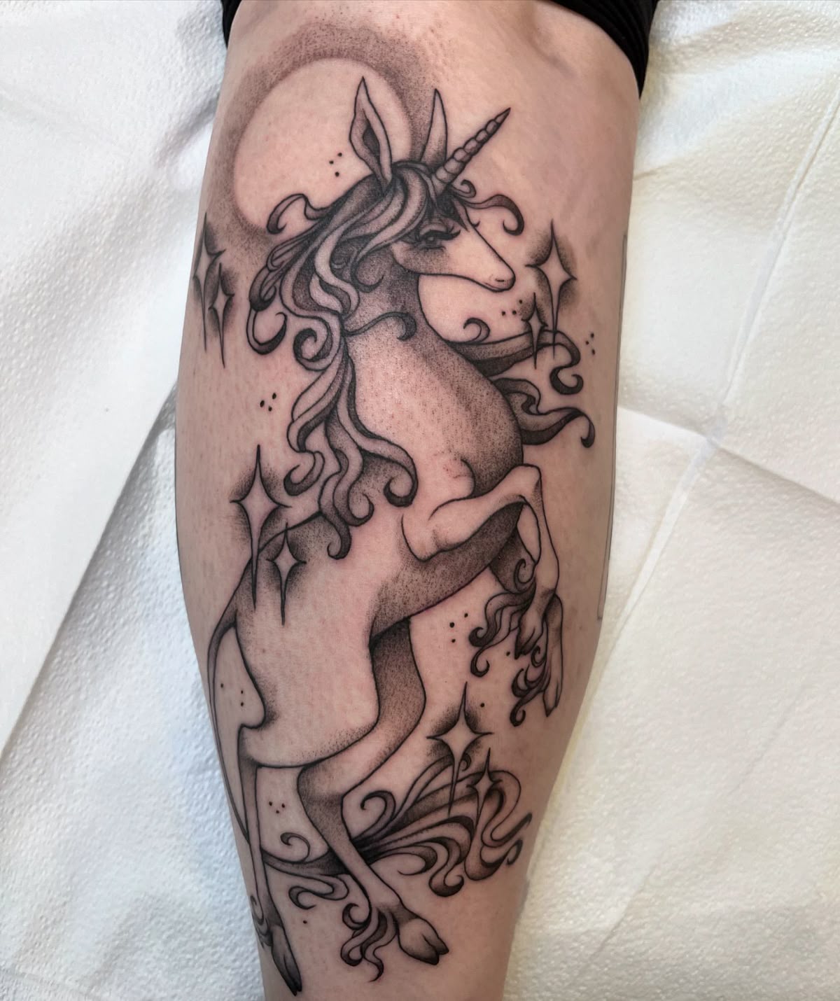 This bad boy black unicorn rearing with the halo of shining stars is the real showstopper. The dotwork shading, the mane as it pours forth from her scalp, and that toughened-up pose lend it this mashup of touchy-feely medieval romance and modern edge, almost like some kind of evolving woodcut. It’s dramatic with no color, which becomes an amazing dark choice for those who love black and white tattoos that can still look rich and three-dimensional. It tugs at your thigh or calf; it imitates the motions of your muscles and turns each footstep into something a little bit more like a jaunty power walk.