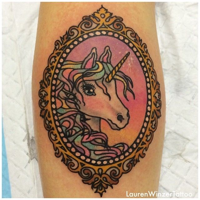 There’s so much fine linework and color blending in the frame and mane; this is one tattoo that definitely pays off with a little extra care—by which I mean diligent moisturizing, sun protection, and those regular visits to your artist for just a little bit of a color refresh. For the person who can’t get enough of intricate designs and doesn’t mind the maintenance (or maybe even prefers it), this cameo-style unicorn is making a statement for eternity, like a painting you wear on your body instead of hanging in your house.