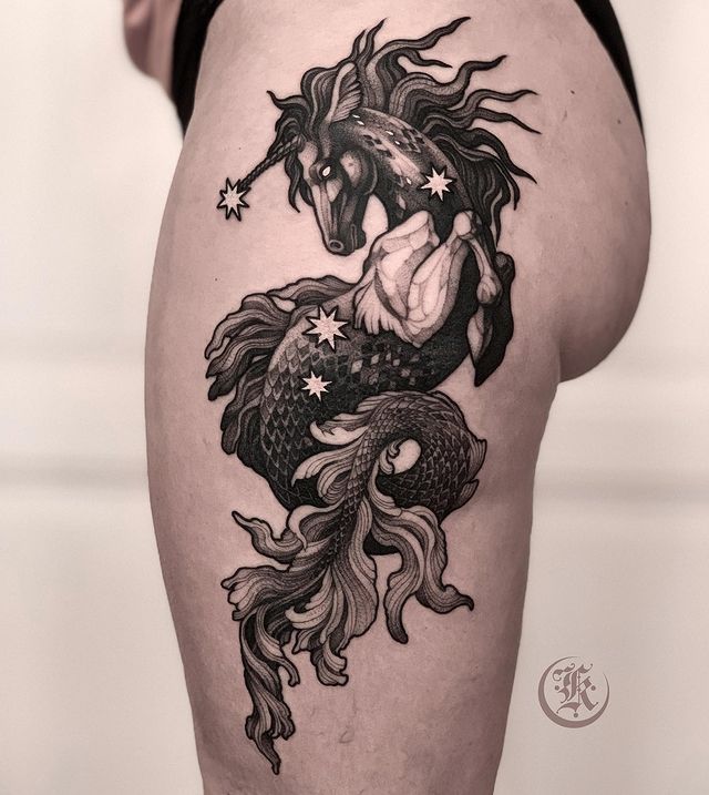 The rearing unicorn and clean and unbroken lines that look like an elegant pen stroke. The pose is such a powerful, athletic one, yet the soft line work balances everything out so well to keep it girly and cute (like some rough sketch you catch in just the right second). It adds gorgeous diversity at a time when you want something plain and unspectacular that nevertheless reflects movement and power. Sitting just off your body and thigh, it flows up one so fucking well with all the natural angles of your physique that you feel a bit ever-so-quietly whimsical each time you catch yourself in a mirror.