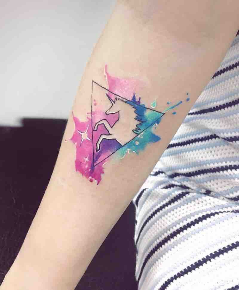This is such a great choice for girls or guys who want really small but really expressive things that feel good every day.” It serves as a nice resting spot for the forearm or ankles, or, if you have room, the calf that’s given breath in that cosmic-tight pretty color-stained halo. Instead of heavy, black lines, you may request that your artist use soft shading and a light touch in outlining. But if you like your whimsy simply happy, this little unicorn keeps things fun and simple without taking down your entire aesthetic.