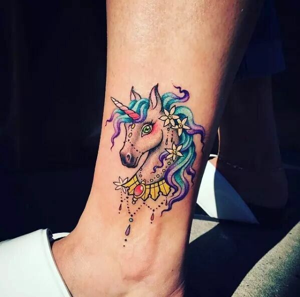 12. Jewel-Collared Color Unicorn Ankle Tattoo