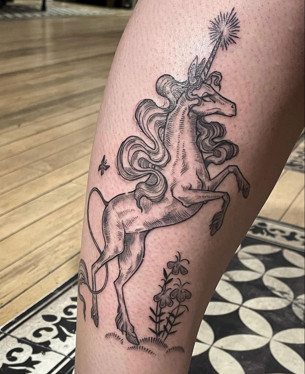 So whether you’re into something tiny and delicate, soft and watercolor-esque, or a full-on dark fantasy thigh piece, unicorn tattoos offer up so many ways to tell your own story. You can keep it sweet and simple with a little fine-line outline, go full cute and cartoonish for kids at heart, or go all in with thick black-and-white Medieval patterns that are practically armor. Really, the only rule here is that your unicorn should feel like you—your humor, your history, and your hopes for whatever comes next.