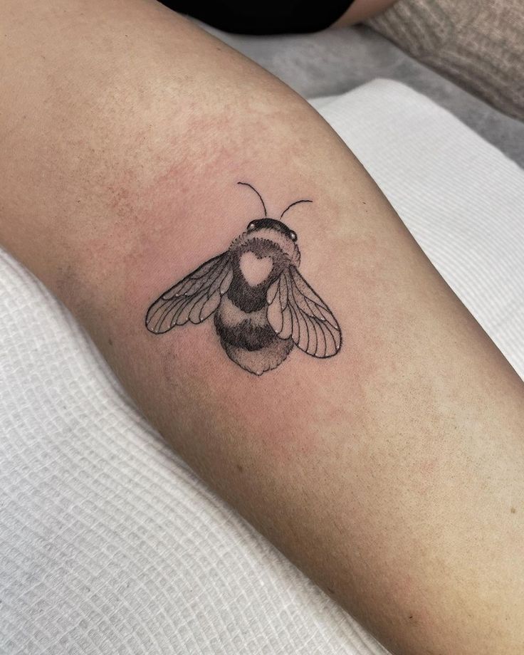 There’s something instantly charming about a bee tattoo that doesn’t try too hard. This one feels soft, thoughtful, and a little poetic, especially with that tiny heart-like marking tucked right into the body. It has that sweet spot between Cute and quietly symbolic, like a small reminder that strength and gentleness can live in the same place. I love animal tattoo ideas like this because they don’t scream for attention, but they absolutely hold it. It feels personal, almost like a secret little emblem for someone who keeps going, keeps building, keeps buzzing through life with more heart than anyone realizes.