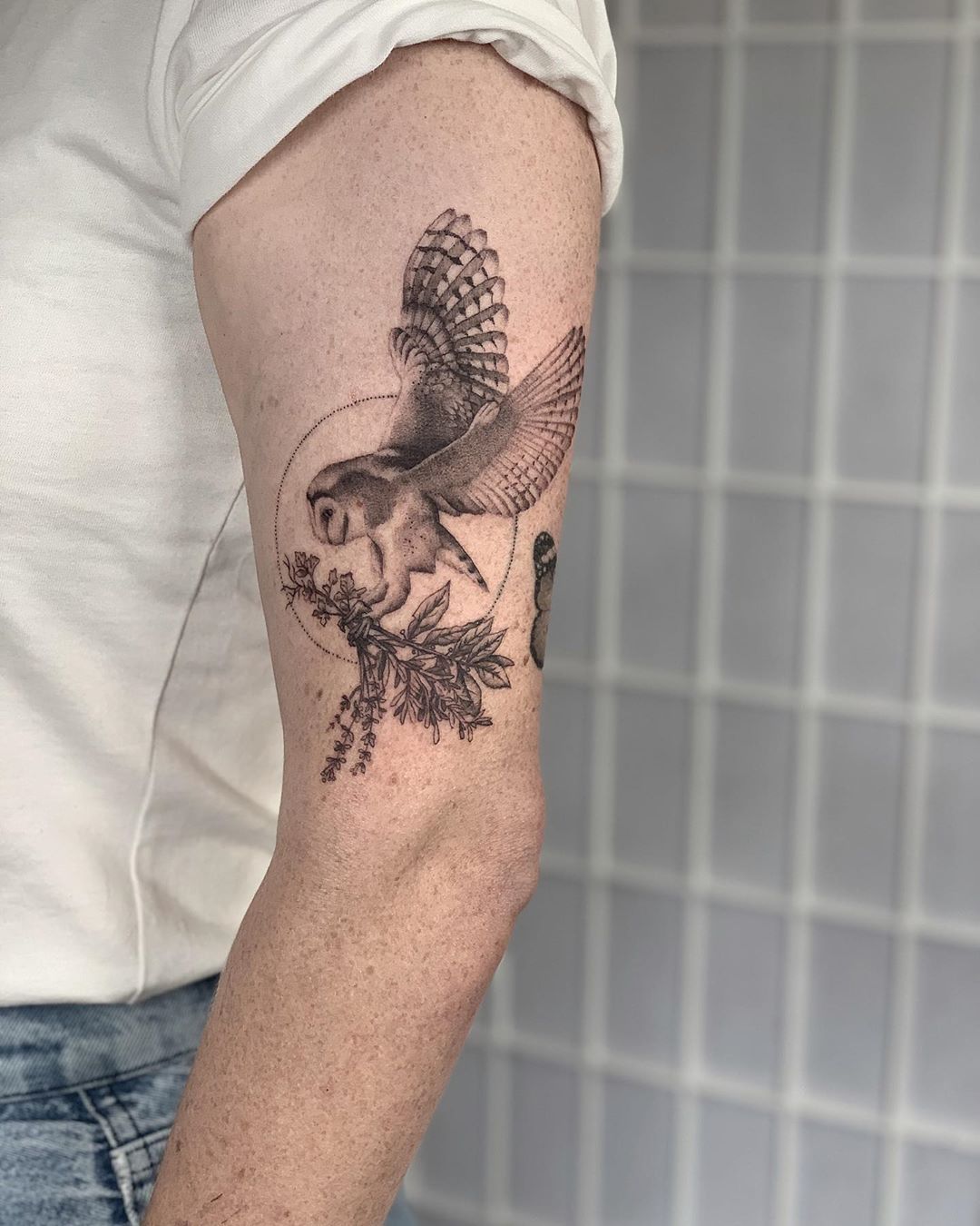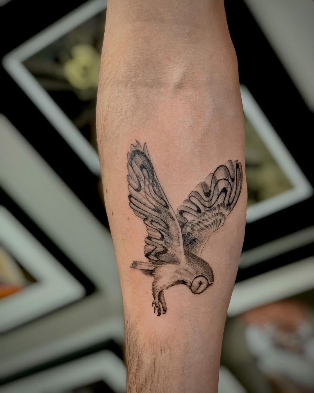 An owl in motion has such a special kind of beauty. It’s not flashy in the obvious way, but it carries mystery, wisdom, and that quiet midnight elegance people are always drawn to. This design feels airy and graceful, almost like it landed for a second and then might disappear into the dark again. I’ve always thought owl tattoos have some of the richest meanings because they can represent intuition, knowledge, protection, or simply a love of creatures that move differently through the world. This one captures all of that in a way that feels light rather than overly dramatic.