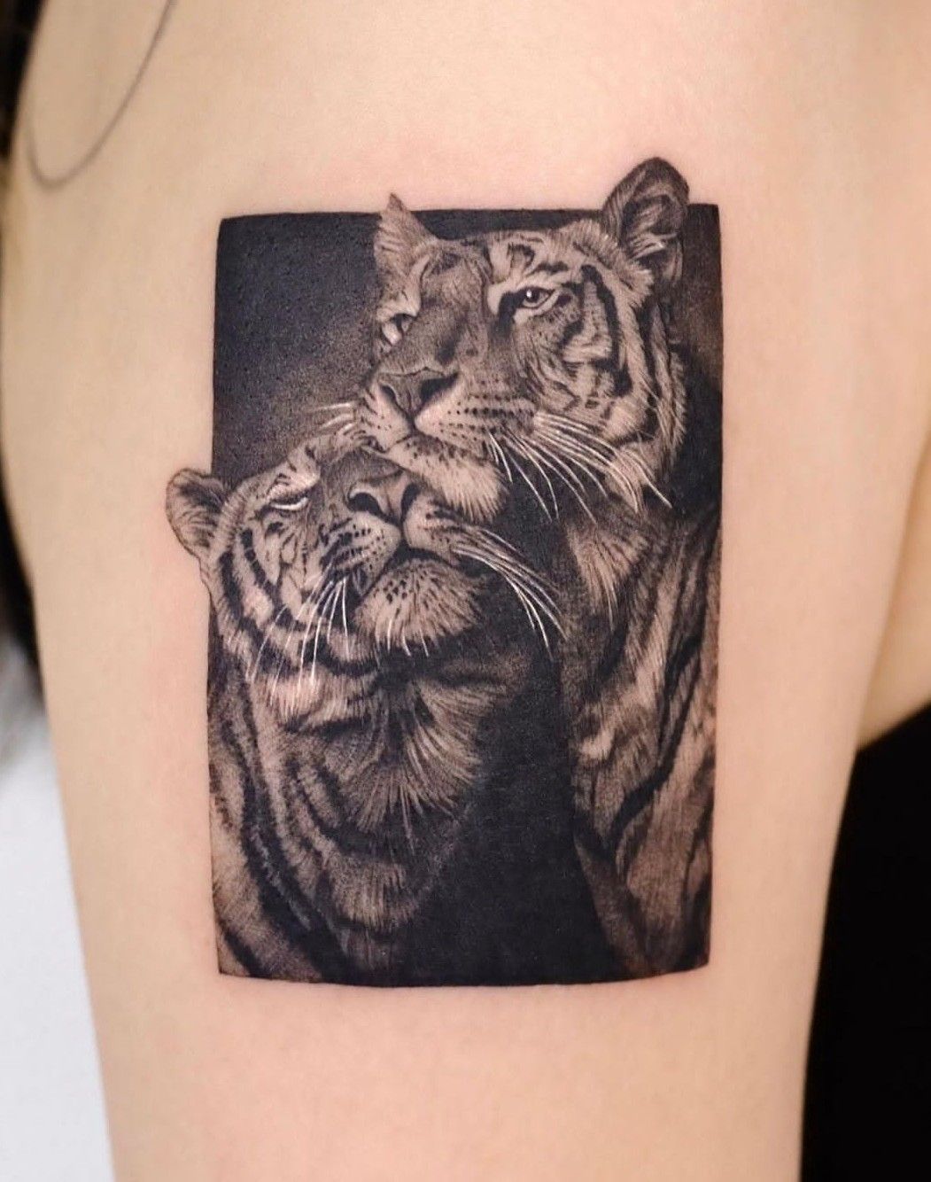 This kind of composition works best on a flatter area like the upper arm, thigh, or back, where the rectangular framing can sit cleanly. It’s a gorgeous option for anyone drawn to Dark, Realistic animal tattoo ideas, especially if you want something a little more soulful than a standard solo predator. The shading here is the star, so choosing an artist with smooth black-and-grey work matters. As inspiration to try now, it’s hard to beat: it feels timeless, personal, and emotionally layered in a way that many trendier tattoos simply don’t.