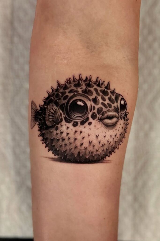 Honestly, this little puffer fish is ridiculously lovable. The oversized eyes, the round spiky body, the tiny mouth—it has that perfect balance of sea-creature weirdness and adorable charm. Some animal tattoo ideas are fierce, some are elegant, and then there are the ones like this that are just plain delightful. It’s Cute without being flimsy, and it still carries a bit of personality and attitude because pufferfish have that funny, defensive, don’t-mess-with-me energy. There’s something refreshing about a tattoo that makes people smile first and admire the artistry second. This one absolutely does both.