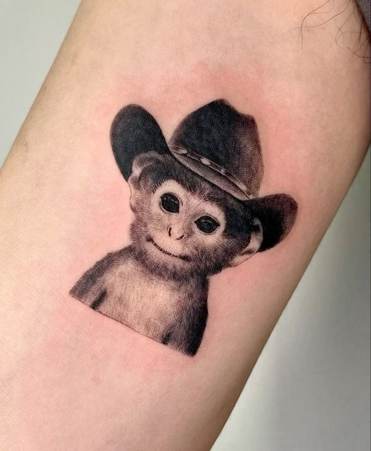 This little monkey in a cowboy hat is exactly the kind of tattoo that reminds you style should be fun. It has that oddball charm that instantly makes it memorable, and the realistic little face keeps it from tipping into gimmickry. There’s personality here—playfulness, confidence, and a touch of mischief. Animal tattoo ideas like this work so well when you want something that feels personal without being too serious. It’s quirky, yes, but also surprisingly stylish. The hat gives it character, and the expression makes it feel like a tiny portrait of someone who has absolutely seen some things.