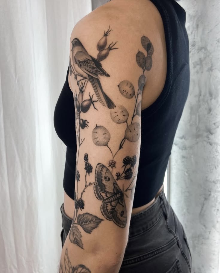 This beautiful Sleeve has that romantic, collected-over-time feeling that so many people love right now. The bird, moth, and delicate plant life come together like pages from an old naturalist sketchbook, only softer and more wearable. It feels artistic, feminine without being overly sweet, and quietly sophisticated. I especially love how it mixes animal and botanical imagery in a way that feels lived in rather than staged. These are the kinds of designs that look even better the more you sit with them. They have story, texture, and a lovely sense of personal style woven into every part.