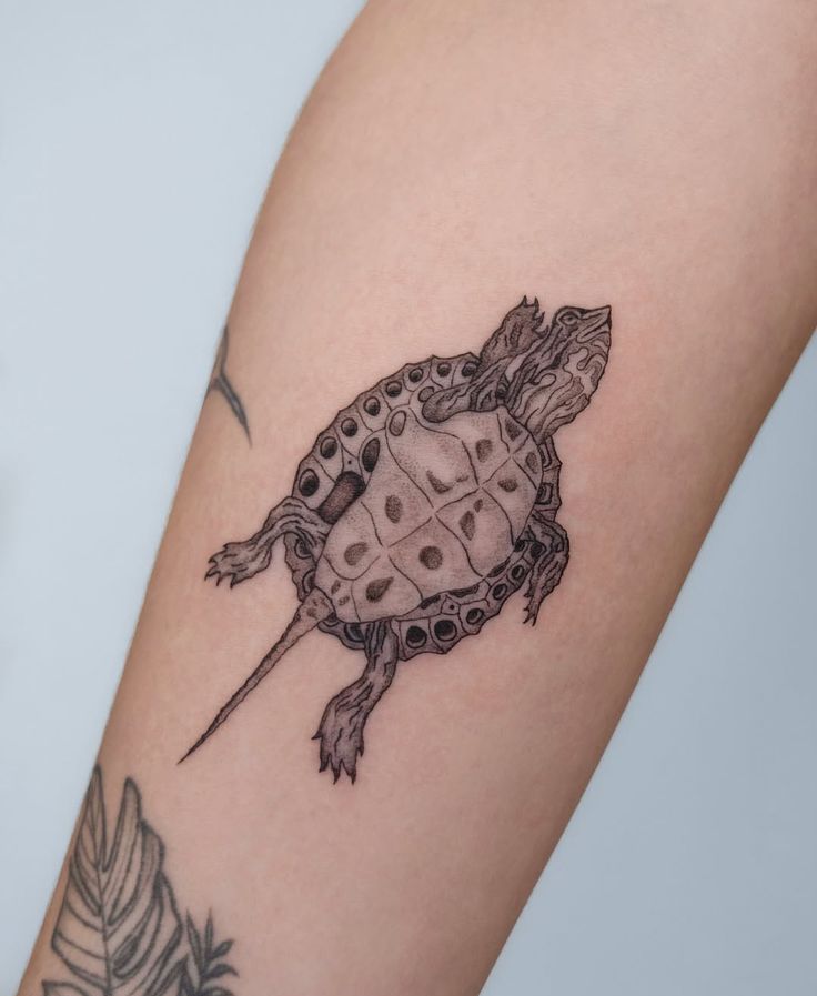 This little turtle has such an easy charm to it. It feels calm, steady, and quietly endearing, like a tiny reminder that not everything needs to happen fast to matter. Turtle tattoos have long been loved for their meanings around patience, protection, endurance, and home, and this one captures that beautifully without feeling too serious or symbol-heavy. It’s one of those animal tattoo ideas that slips effortlessly into everyday style because it feels timeless. Nothing forced, nothing flashy, just a lovely creature rendered in a way that feels personal, balanced, and sweet.