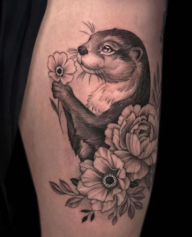This otter tucked into a bed of blooms feels soft, romantic, and a little dreamy in the best way. There’s something so naturally sweet about otters anyway, but pairing one with lush flowers makes the whole design feel even more tender and expressive. It doesn’t come off sugary, though. It still has sophistication, especially in the way the fur and petals are balanced. These are the animal tattoo ideas that feel like they belong to someone with both a playful heart and a sharp eye for beauty. It has a calm, affectionate mood that lingers, almost like a favorite perfume or a song you keep replaying.