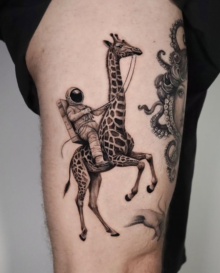 This one is wonderfully surreal in the best possible way. A giraffe is already elegant and unforgettable, but add an astronaut and suddenly the whole tattoo becomes a little dream, a little joke, and a lot of art. It feels like curiosity made visible. I love designs like this because they say the wearer has imagination and probably a very good sense of humor too. These are the animal tattoo ideas that refuse to be ordinary. They create their own world and invite you into it, which is exactly why they stand out even in a room full of tattoos.