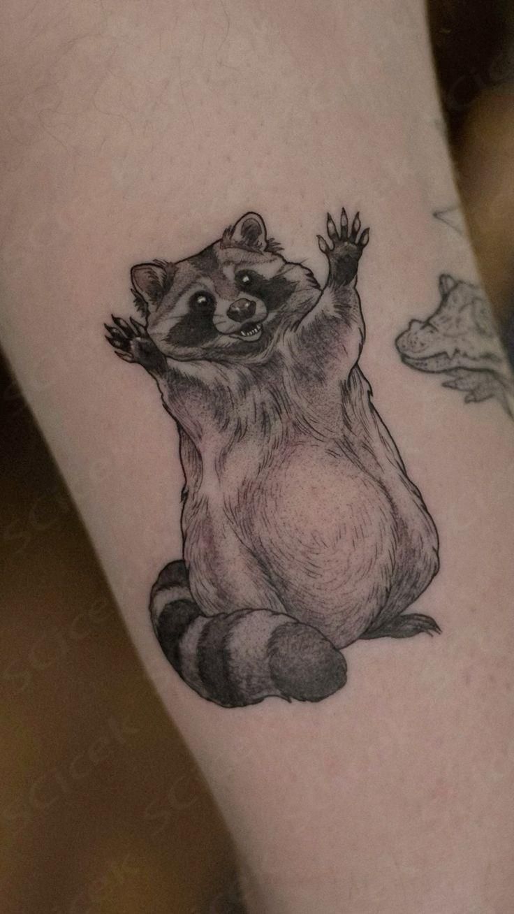 This raccoon feels like the extrovert of the tattoo world. The raised paws, round belly, and cheerful expression make it impossible not to smile. It has that perfectly balanced mix of wild-animal charm and cartoon-like friendliness, which makes it incredibly approachable. Not every tattoo has to feel deep and mysterious. Sometimes the payoff is simply joy, and honestly, that’s reason enough. Still, raccoons do carry their own little meanings too—adaptability, cleverness, and curiosity—so there’s more here than just a Cute design. It feels like a reminder to stay scrappy, resourceful, and just a little playful.