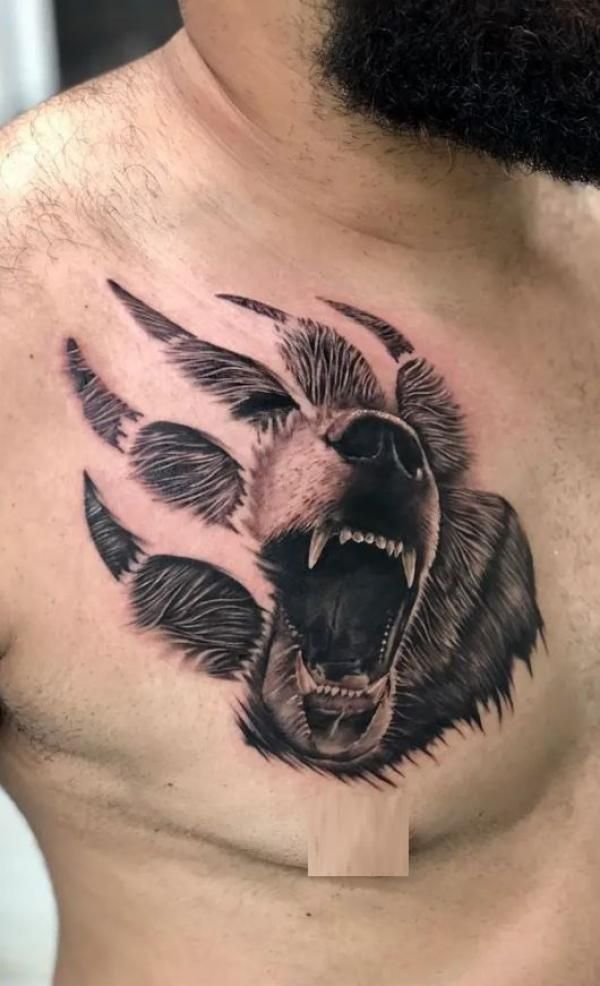 For men especially, this is the kind of design that suits broad placements where the drama can really land. The chest gives it maximum impact, though it could also work on the back or shoulder. What makes it special is the illusion of movement created by those torn-edge shapes, which gives it more aggression than a standard animal portrait. If you’re choosing between a calm bear and something far more intense, this one wins on attitude alone. It’s bold, unapologetic, and definitely not for someone who wants their tattoo to quietly blend in.