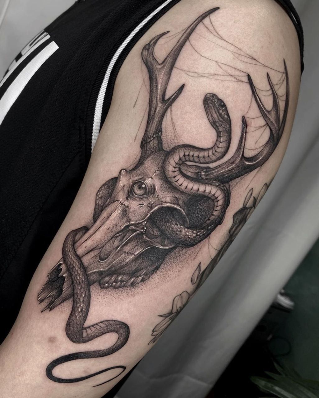 What makes this one special is the layering of symbols without the design feeling cluttered. The antlers stretch the composition beautifully, while the snake keeps the eye moving through the piece. It’s ideal for larger placements like the thigh or upper arm, where the details can breathe. Compared with a simpler deer or serpent tattoo, this feels much more narrative and Dark. It’s especially strong for men, ideas for men, or anyone who wants something dramatic and deeply expressive. Choose an artist with confident shading and texture work, because that’s exactly what gives this design its haunting power.