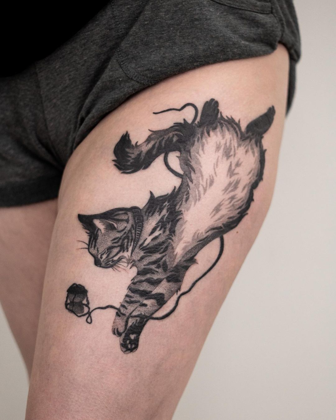 If your style leans a little whimsical, a little offbeat, and very much “I like what I like,” this cat design is a delight. It has movement, humor, and that wonderfully chaotic feline energy that every cat person understands without explanation. The floating pose and loose yarn detail make it feel like a snapshot from a dreamy, slightly mischievous little universe. These are the kinds of animal tattoo ideas that feel alive on the skin. It’s not just a cat tattoo; it’s attitude, comfort, personality, and a small wink to the fact that life is better when it’s not too polished.