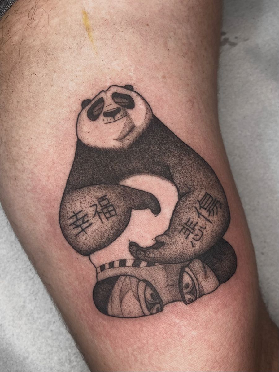 This panda tattoo has such a relaxed, feel-good energy that it almost reads like a little charm for a better life. The pose is easygoing, the expression is smug in the cutest way, and those lucky script details give the whole piece a playful layer of meaningful symbolism. I love animal tattoo ideas like this because they can be lighthearted and personal at the same time. A panda already brings that lovely mix of softness and quiet strength, but here it also feels lucky, grounded, and just a little cheeky. It’s the kind of tattoo that says you believe in good fortune, but you also know how to enjoy the ride.