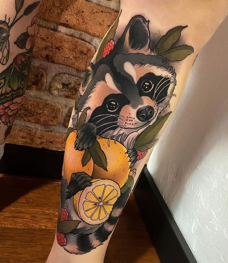 Now this is pure personality. A raccoon already has that lovable troublemaker reputation, but paired with bright fruit and leafy accents, it becomes something even better—playful, cheeky, and wildly memorable. It feels like a tattoo for someone who doesn’t mind standing out and honestly enjoys it. There’s humor here, but it’s stylish humor, the kind that makes people smile and then ask where you got it done. Among animal tattoo ideas, raccoon designs are such a fun surprise because they carry that mix of intelligence, adaptability, and charm in a way that never feels too serious.