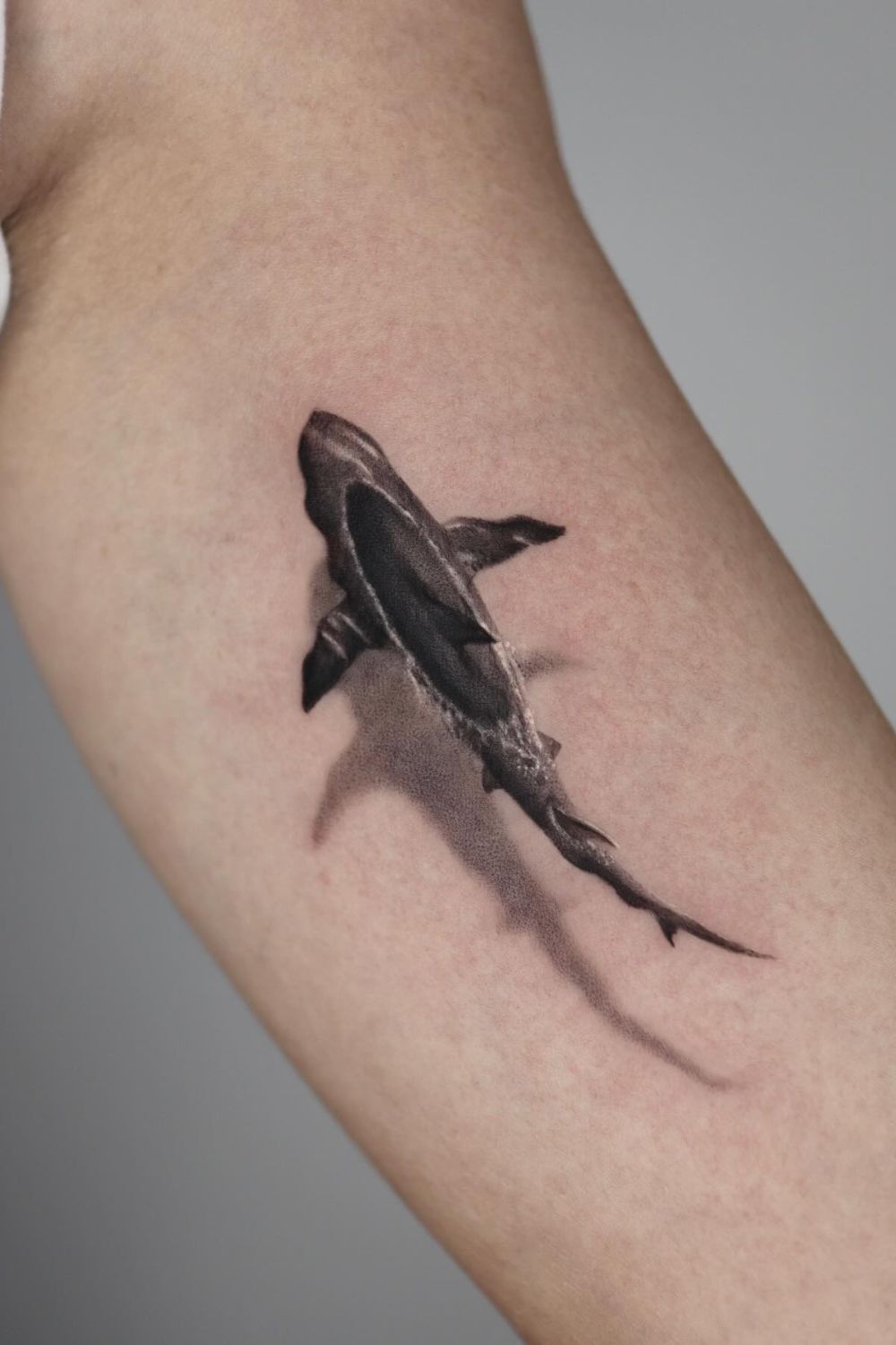 This shark tattoo has that gorgeous sleek menace that makes it feel instantly cool. The shadow underneath gives it a sense of depth and motion, like it’s gliding just below the surface where things are calm until they very much are not. Shark designs are powerful without being noisy. They suggest instinct, focus, survival, and a kind of elegant toughness that doesn’t need decoration. If you love Ocean or Marine tattoo ideas, this one feels especially strong because it captures the beauty of the animal rather than turning it into a cliché. It’s sharp, modern, and very self-possessed.