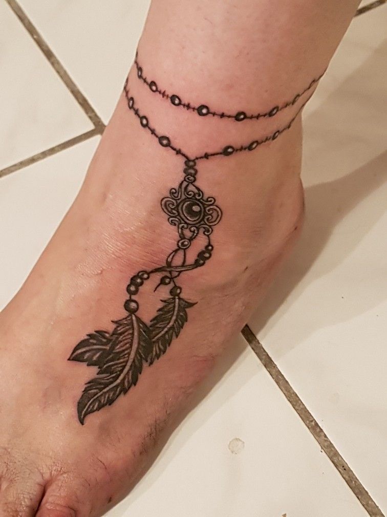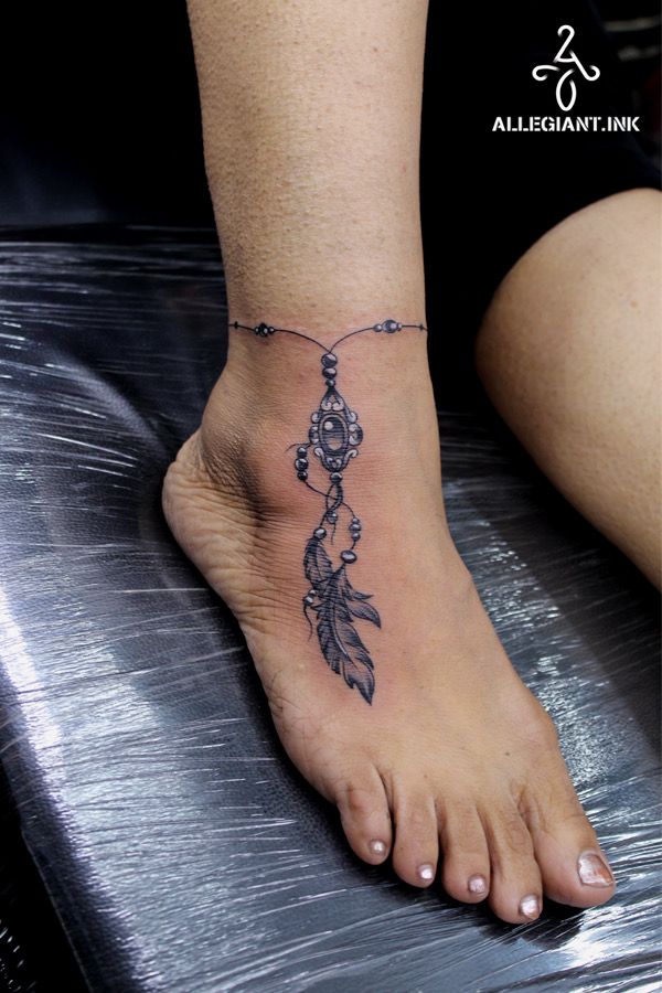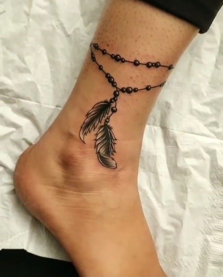 Now this is the kind of anklet tattoo that makes a whole outfit feel more interesting. The double chain, the intricate center medallion, and the two trailing Feather elements create a look that feels rich, detailed, and full of personality. It has a little bit of bohemian glamour, a little bit of vintage ornament, and a whole lot of style. Some anklet tattoo ideas are pretty in a quiet way, but this one has a stronger story to tell. It feels artistic, soulful, and confident, like the person wearing it knows exactly who they are.