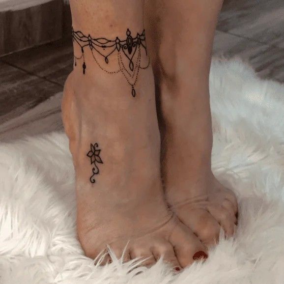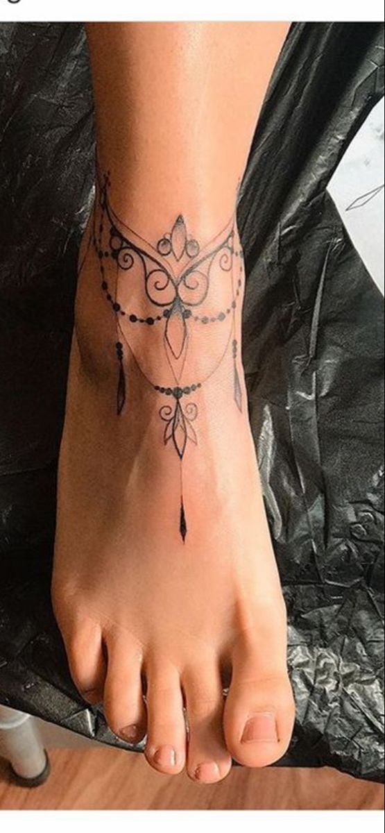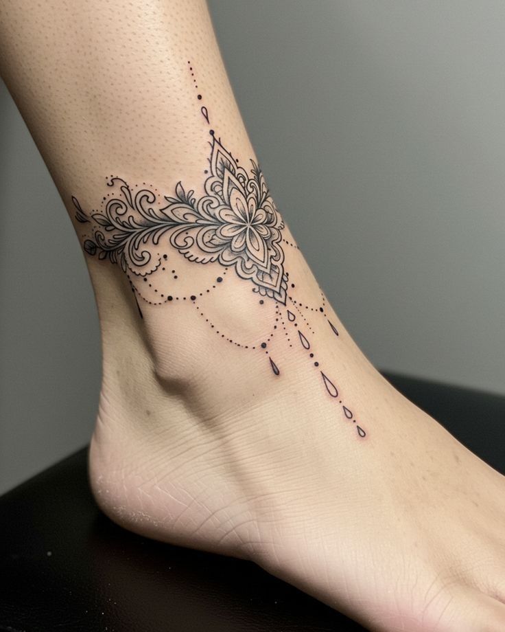 This tattoo is absolutely stunning in that soft, intricate way that makes you stop and stare for a second. The mandala-inspired center, the scrolling side details, and the dotted drops create a look that feels like lace, jewelry, and body art all at once. It’s elegant, yes, but it also has a calm, almost meditative beauty to it. Among more refined anklet tattoo ideas, this one feels especially sophisticated. It gives the ankle shape and ornament without ever looking bulky, and the overall mood is graceful, feminine, and beautifully composed.