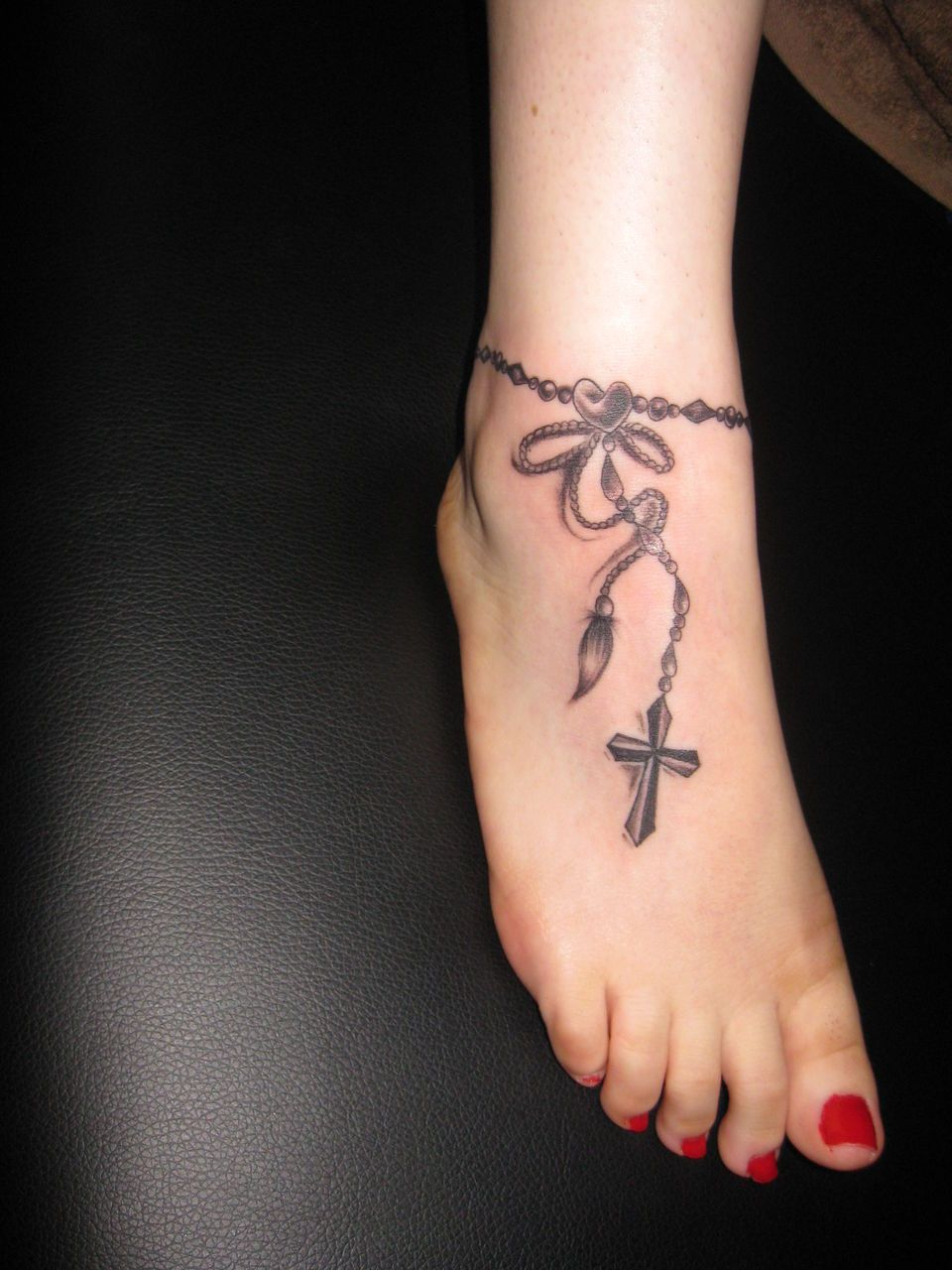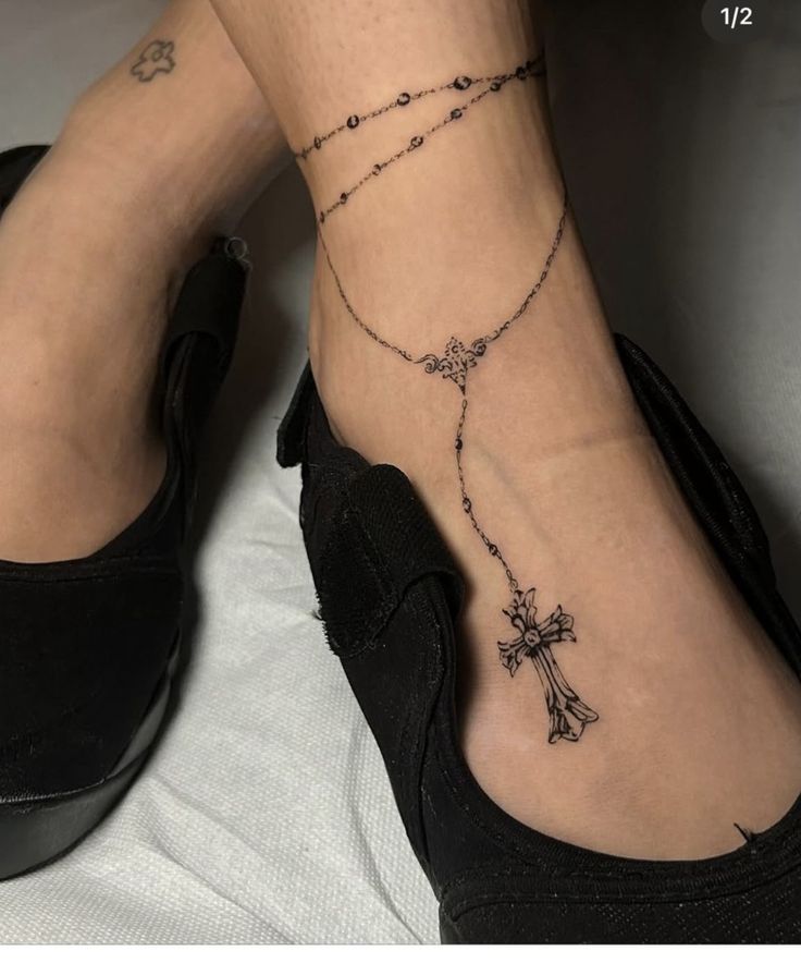 Sometimes the smallest tattoos leave the strongest impression, and this one proves it. The fine anklet chain with a tiny dangling cross has such a soft, graceful presence that it almost feels effortless. It doesn’t try to dominate the ankle; it simply adds that whisper of meaning and style that makes bare feet, sandals, and even simple slides feel more considered. I think that’s the beauty of understated Rosary-inspired anklet tattoo ideas like this. They can feel spiritual, sentimental, stylish, or all three at once, depending on the person wearing them.