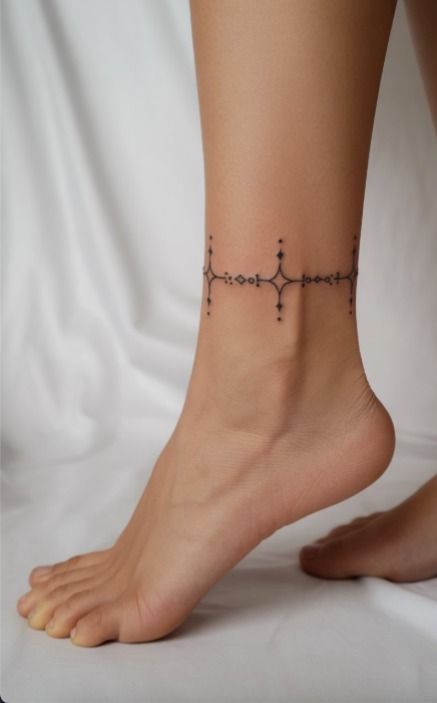 This one is for the minimalist at heart. The tiny geometric shapes, slim linework, and perfectly measured spacing create an anklet tattoo that feels modern, clean, and quietly sophisticated. It doesn’t rely on hearts, flowers, or dangling charms to make an impression. Instead, it uses balance and restraint, and honestly, that can be even more powerful. Among all kinds of anklet tattoo ideas, this is the sort of design that feels effortlessly cool. It has that subtle architectural beauty that makes you look twice because it’s so crisp and intentional.
