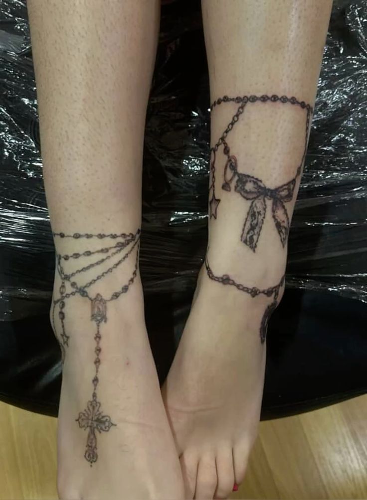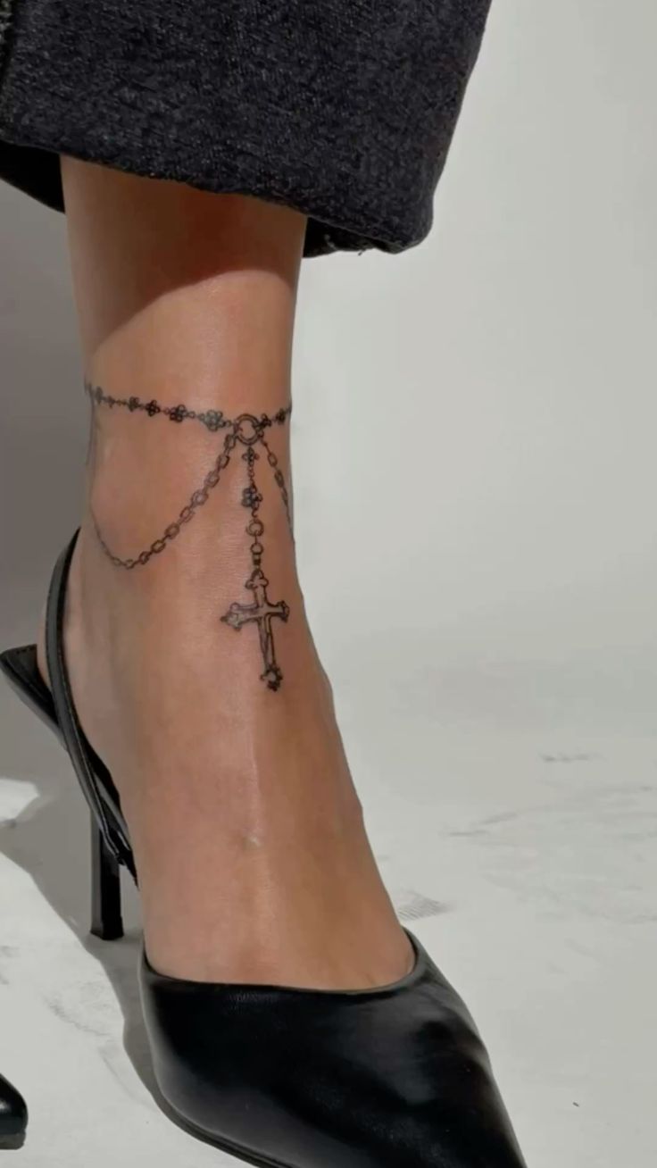 There’s something so effortlessly elegant about a slim anklet line paired with a dangling cross. It feels devotional, stylish, and quietly dramatic, especially with the delicate draped chain detail that softens the whole piece. This kind of Rosary-inspired tattoo has a way of looking both graceful and strong at the same time, which is a beautiful combination. It doesn’t overwhelm the ankle, yet it still makes a statement. If you’re drawn to anklet tattoo ideas that mix symbolism with fashion, this one has that lovely in-between quality that makes it feel deeply personal.