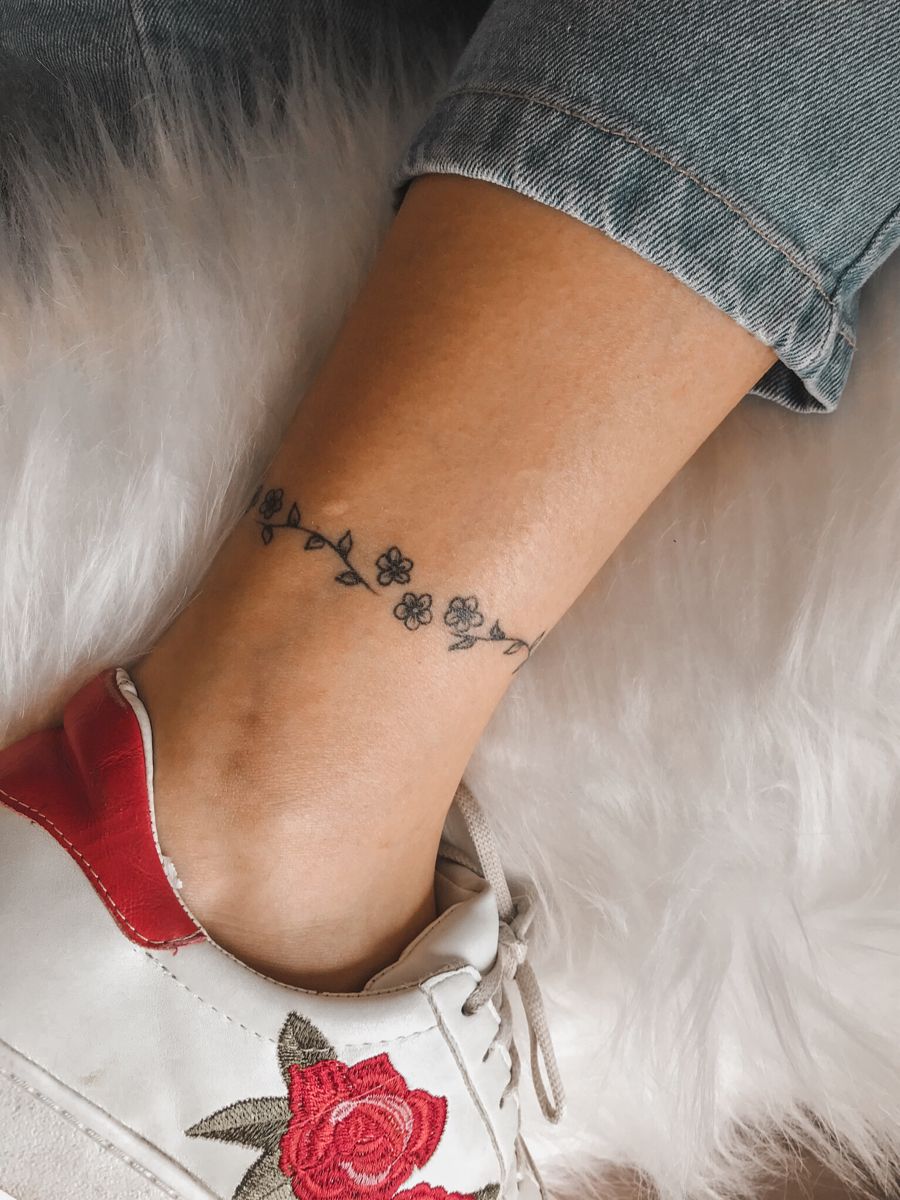 There’s something so easy and lovely about a slim floral vine wrapped around the ankle. It feels natural, quiet, and a little nostalgic, like pressing tiny flowers into a journal and deciding to keep that feeling forever. The small blossoms and scattered leaves make this one feel delicate without being fussy, which is exactly the kind of beauty a lot of people want in an ankle tattoo. Flower anklet tattoo ideas like this are timeless because they never try too hard. They just add a little softness, a little femininity, and that effortless pretty factor that always works.