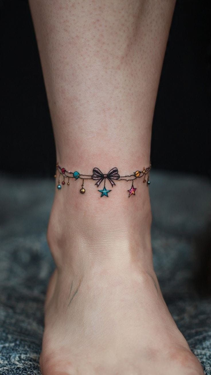 Well, this one is just plain fun. The tiny bow, little dangling stars, and colorful bead-like accents give it that playful, youthful sparkle that feels like summer jewelry turned into ink. It’s cheerful without being childish, and there’s something so charming about the way it wraps around the ankle like a festive little bracelet. Some anklet tattoo ideas lean serious or symbolic, but this one feels lighthearted and full of personality. It has that sweet, expressive mood that instantly brightens the whole look, especially if you like tattoos that feel whimsical and a little bit flirty.