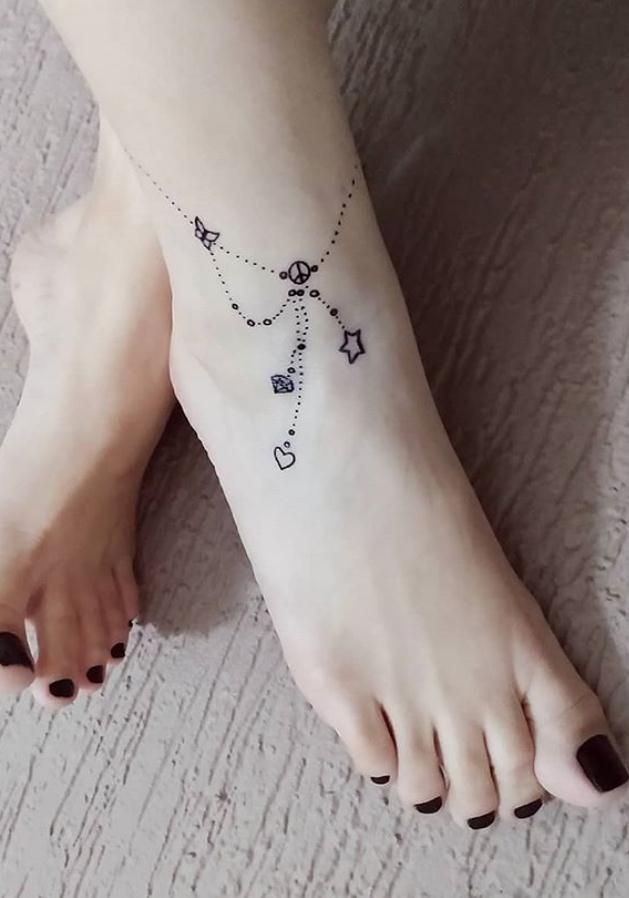 This style practically begs to be worn with a glossy pedicure, a slip dress, or delicate gold earrings if you want the whole look to feel coordinated. It’s a wonderful choice for women’s chains fans who enjoy jewelry-inspired designs and want that same decorative feeling in tattoo form. Because there are multiple small shapes and beads, aftercare matters if you want those details to heal cleanly. Keep the area protected from shoe rubbing as much as possible early on. If your style leans romantic, polished, or a little flirty, this tattoo slips right into that mood beautifully.