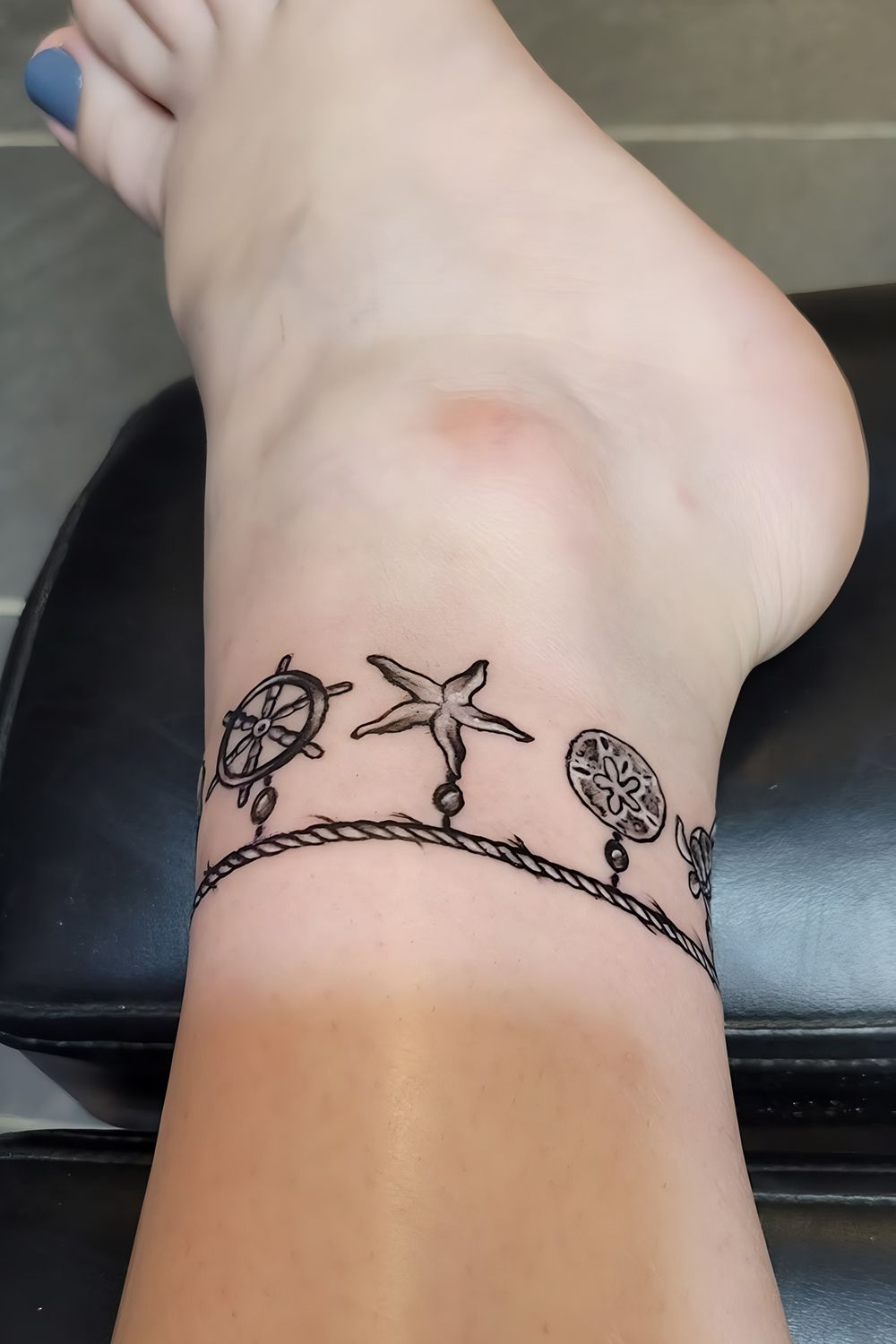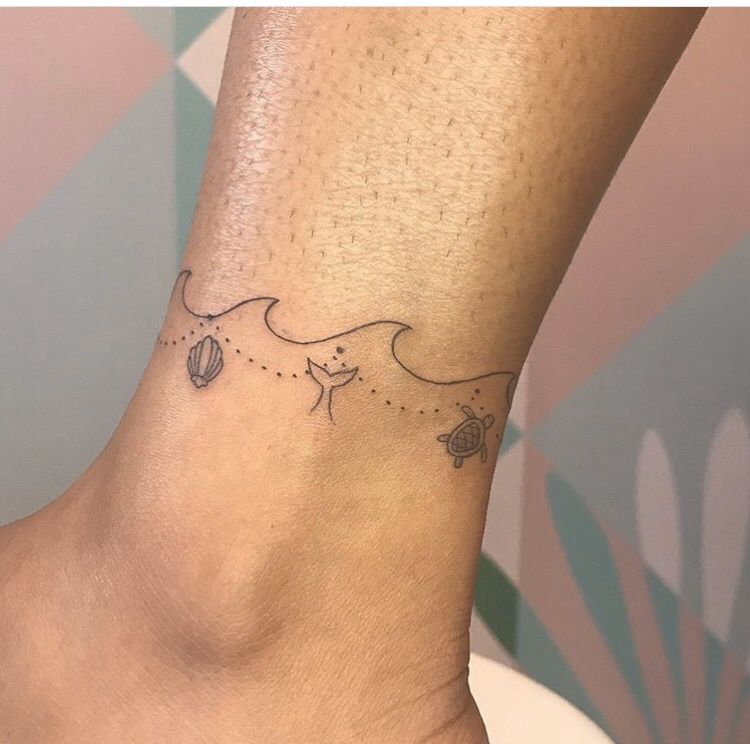 This one is such a fun little surprise because it turns the ankle into a beach bracelet. The rope-like band and ocean-inspired symbols give it a playful, vacation-ready personality that feels relaxed and personal at the same time. It’s not the typical floral or heart anklet, and that’s exactly why it works so well. The tiny nautical touches feel lighthearted without looking cartoonish, and the overall effect is fresh, breezy, and a little nostalgic. If you love tattoos that remind you of travel, water, summer, or freedom, this is one of those anklet tattoo ideas that just makes sense.