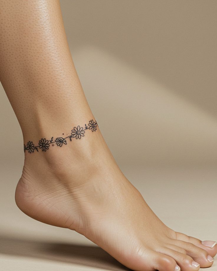 This little floral anklet is pure sunshine. The alternating blossoms create such a sweet, easy rhythm around the ankle that it almost feels like a tiny daisy chain you never have to take off. It’s feminine, cheerful, and wonderfully uncomplicated, which is honestly part of the magic. Flower designs like this don’t try to be dramatic; they just make everything feel softer and prettier. If your personal style leans natural, relaxed, and a little romantic, this kind of tattoo slips right in without effort. It has that barefoot-in-the-garden kind of beauty that always feels fresh.