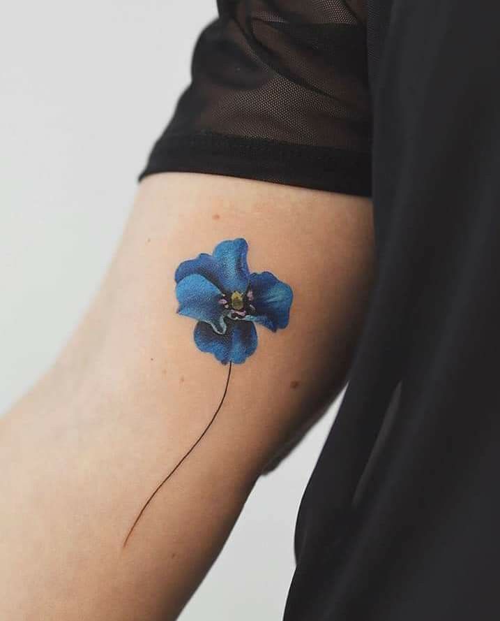This is a lovely choice if you want something delicate on the inner arm, ankle, ribs, or behind the shoulder. The low-maintenance beauty of this design is that it does not need a lot of extra detail to feel complete. Keep the stem clean and let the blue flower be the star. It is especially flattering for anyone who prefers smaller tattoo ideas, and it pairs beautifully with simple jewelry, a black dress, or even a relaxed white tee and jeans.