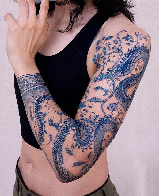 If you are dreaming of a larger sleeve or half-sleeve, this is strong inspiration. It suits people who want all-over arm coverage without the heaviness of traditional dark shading. The current trend toward ceramic and porcelain-style tattoos makes this feel very fresh for 2026, especially when the blue is layered with soft negative space. Work with an artist who can map the dragon around your arm so it flows naturally from every angle.