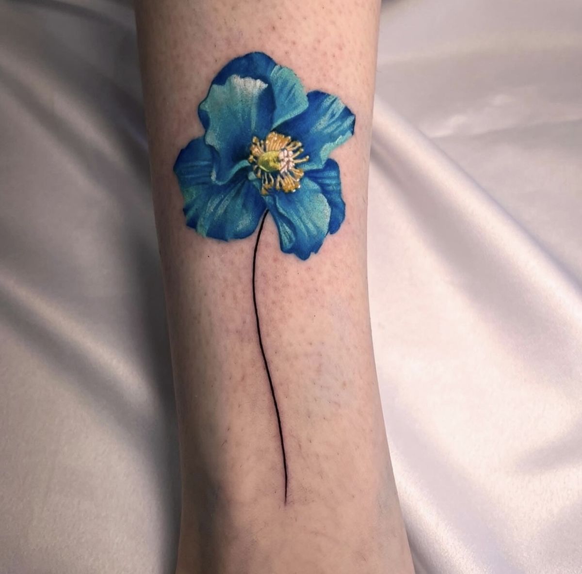 This blue poppy feels like the kind of tattoo you choose when you want something soft, feminine, and quietly unforgettable. The petals have that moody navy depth with lighter teal touches, so the whole flower looks dreamy without becoming too sweet. It has a graceful, almost poetic feeling, like a little reminder to stay open, beautiful, and just a bit mysterious. For women who love floral ink but want something fresher than the usual pink rose, this is such a stylish twist.