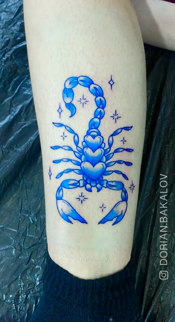 This design is best for the calf, outer arm, thigh, or shoulder, where the scorpion shape has enough space to stretch. It is a great choice for men and women who want a confident tattoo that still feels colorful and playful. The motivation to try this now? Blue gives the scorpion a totally different mood than black: less gothic, more electric. Keep the shading smooth and the outlines strong so the shape holds up beautifully over time.