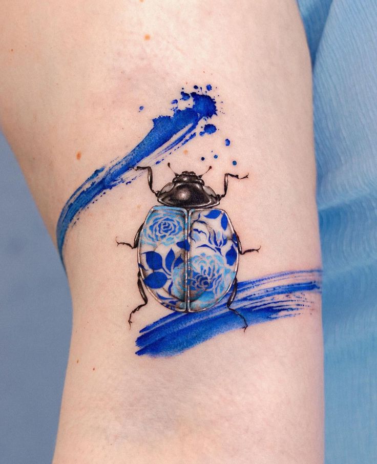 This beetle tattoo is quirky, elegant, and honestly a little fabulous. The wings look like tiny blue china plates, decorated with flower details and framed by painterly brushstrokes. It has that “collector of beautiful strange things” feeling, which I love. There is something symbolic here too: beetles can suggest protection, transformation, and resilience, but the blue pattern softens the whole mood into something more graceful and wearable.