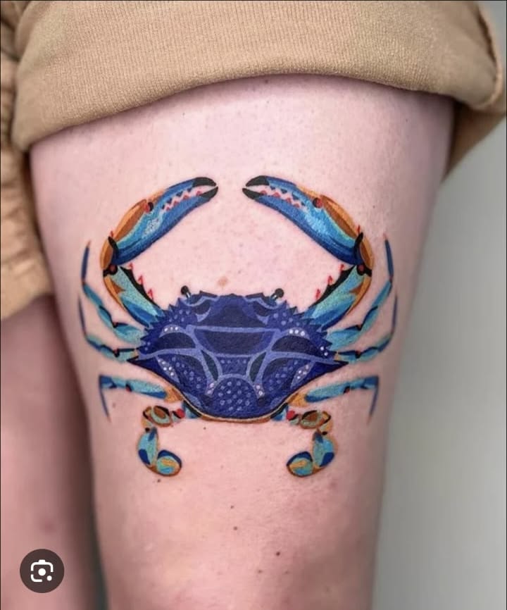 This design is great for anyone who loves ocean themes, zodiac Cancer symbolism, or colorful ink that feels joyful. It works best on the thigh, upper arm, or calf, where the shape can spread out symmetrically. What makes it special is the mix of cartoon brightness and tattoo realism, so choose an artist who can handle saturated color and clean edges. Pair it with beachy style, gold jewelry, or a crisp white outfit and let the blue do its thing.