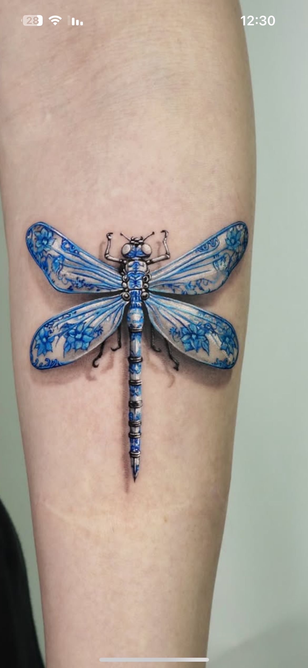 This design is lovely for the forearm, calf, shoulder blade, or upper arm. It works especially well if you want a statement piece that still feels airy because the wings keep the design open. For care, protect it from sun and avoid rushing the healing process, since pale blue and fine interior details need kindness. Choose an artist who can combine realism, fine line work, and soft Delft-inspired patterning for the best result.