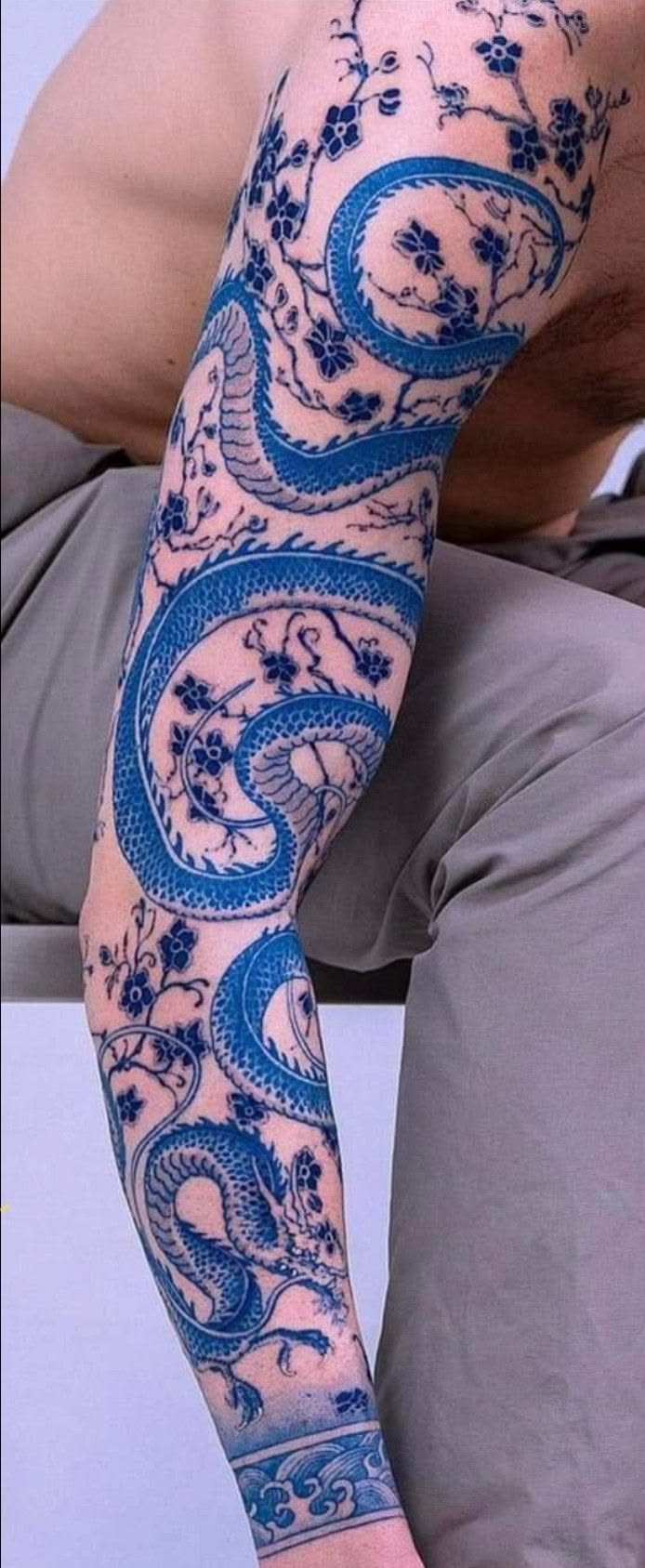 Now this is a statement. The blue dragon sleeve has power, elegance, and that fearless “I know exactly who I am” energy. The swirling body, floral details, and porcelain-style blue shading make it feel both fierce and refined, like a piece of ceramic artwork wrapped around the arm. It is bold without looking heavy, which is the magic of using blue instead of solid black and gray throughout the whole design.