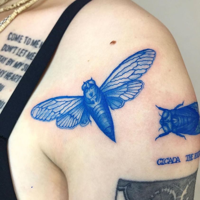 This blue cicada tattoo has a strong, almost mythical presence. The open wings feel delicate, but the body gives the design structure and confidence. Cicadas are wonderful symbols of transformation, timing, and re-emergence, which makes this piece feel especially meaningful for anyone stepping into a new chapter. The blue ink gives it an unexpected coolness, turning a nature-inspired tattoo into something sleek and artful.