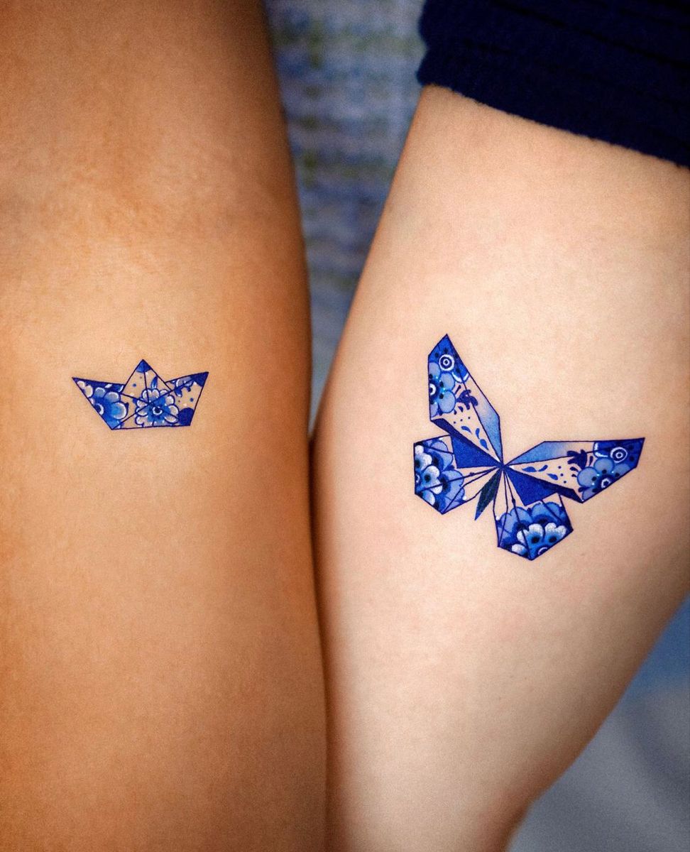 These matching blue origami tattoos are sweet in the most grown-up way. One tiny folded boat and one butterfly-like shape create a shared story without being too obvious or sentimental. The blue floral pattern gives them that delicate porcelain charm, while the geometric folds keep the whole thing crisp and modern. It feels like friendship, family, love, or memory captured in a tiny paper keepsake.