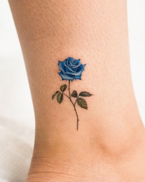 This is a sweet option for the ankle, inner arm, wrist, or behind the shoulder if you want a tattoo that stays soft and easy to wear. It is especially good for anyone who likes flower designs but does not want a large piece. The emotional payoff is that it gives you beauty without demanding attention, which is sometimes exactly the mood. Ask your artist to keep the leaves clean and the blue petals layered, so the rose does not turn into a flat spot over time.
