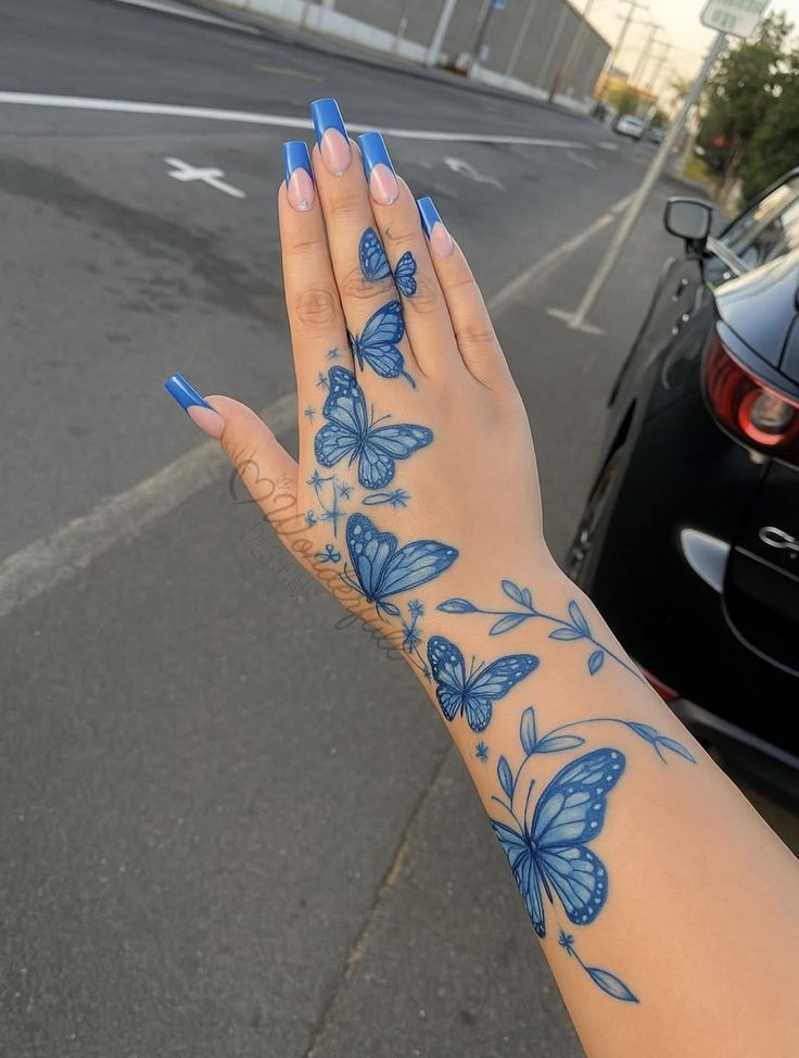 This blue butterfly trail is playful, feminine, and very much the kind of tattoo that wants to be seen. The butterflies move from the wrist toward the hand with a light, fluttery rhythm, and the tiny leaves make everything feel a little more romantic. It has that fresh manicure-and-confidence energy, especially with matching blue nails. The whole look says, “Yes, I planned this, and yes, it looks fabulous.”