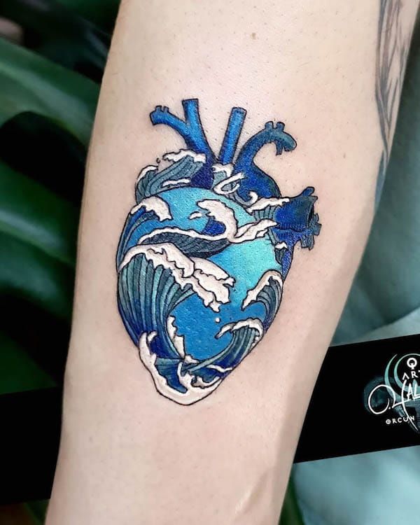 This is a strong choice for the inner forearm, upper arm, or calf, especially if you want a medium-sized tattoo with personal symbolism. What makes this cut — or rather, this design — special is the contrast between anatomy and nature. It is not a basic heart, and it is not a basic wave; it is both, blended into something more personal. Ask for bold enough outlines so the heart shape stays clear even as the blue softens with time.