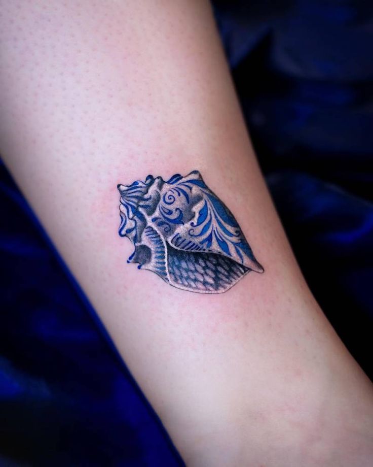 This little seashell tattoo has a calm, coastal beauty that feels timeless. The blue shading gives it a cool ocean mood, while the shell shape adds texture and quiet elegance. It is not flashy, but it has that lovely collected-on-a-beach feeling, like a memory you decided to keep on your skin. The subtle patterning makes it feel more artistic than a simple shell outline.
