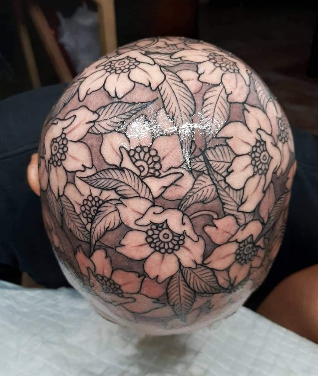 Covering the entire Top of the scalp with flowers creates a breathtaking visual effect, almost like wearing a crown made of ink. The pattern spreads gracefully across the head, each petal blending into the next. It feels artistic, soft, and surprisingly elegant despite the bold placement.