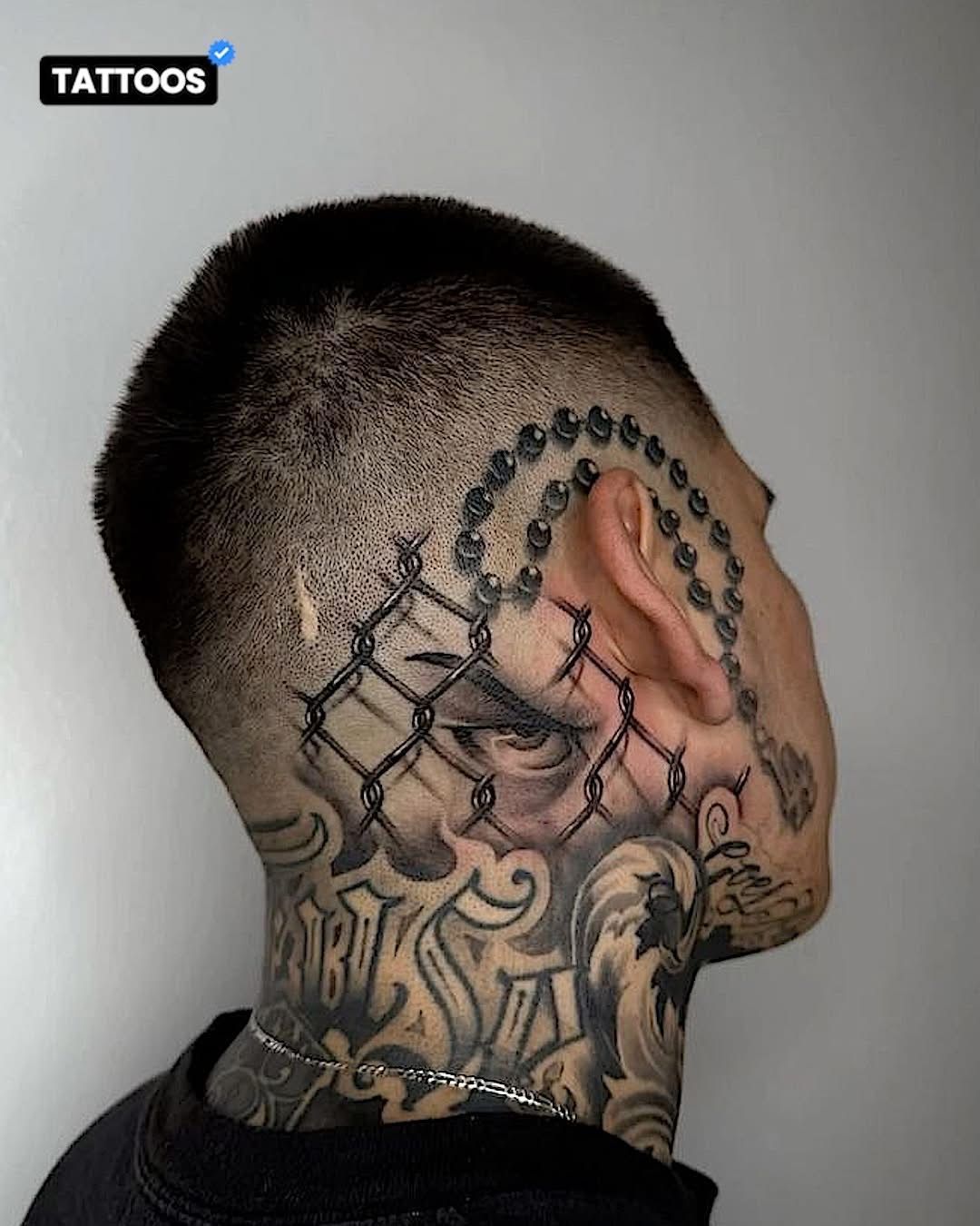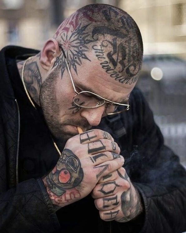 A Bald head covered in expressive lettering tattoos carries a strong, unmistakable attitude. There’s a raw authenticity to it—like wearing your beliefs right out in the open. The combination of script, symbols, and layered ink creates a powerful visual rhythm across the scalp. It feels personal, almost like a story written directly onto the skin.