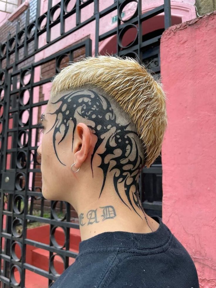 For men especially, expressive blackwork men ideas like this offer a way to combine storytelling and strong visual impact. The shaved fade keeps the artwork visible while maintaining a clean haircut. If you’re drawn to head tattoo ideas that feel rebellious, artistic, and full of personality, this style makes a striking statement.